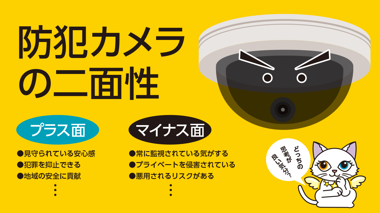 常に監視されプライベートを侵害されているというマイナス面と、犯罪の抑止や見守られている安心感などのプラス面。