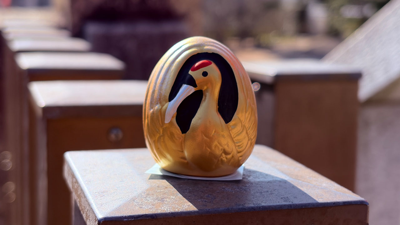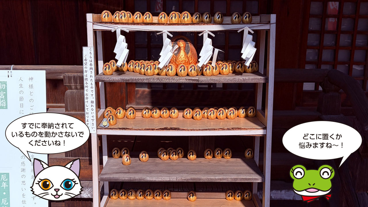 それでは、願いを込めた「金の願い鶴」を、拝殿近くに設けられている奉納台に納めましょう。