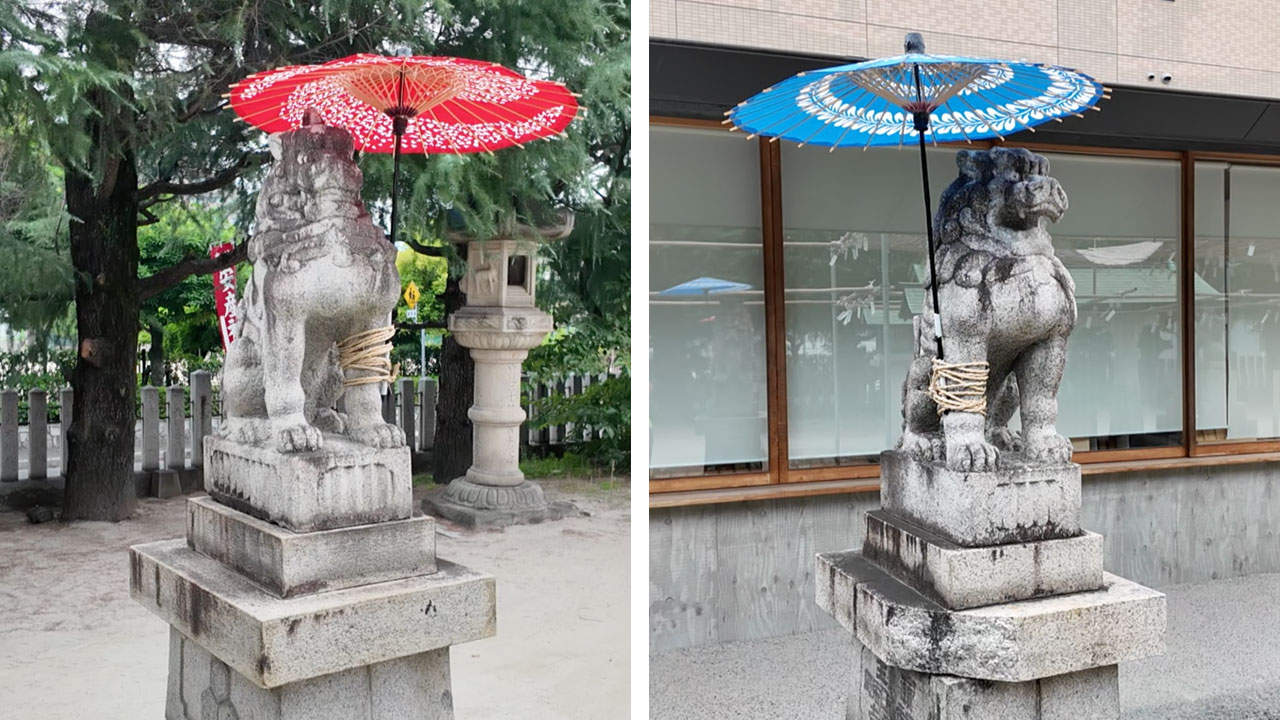 この狛犬は座っているタイプ。和傘を付けてもらっていますね(笑)。