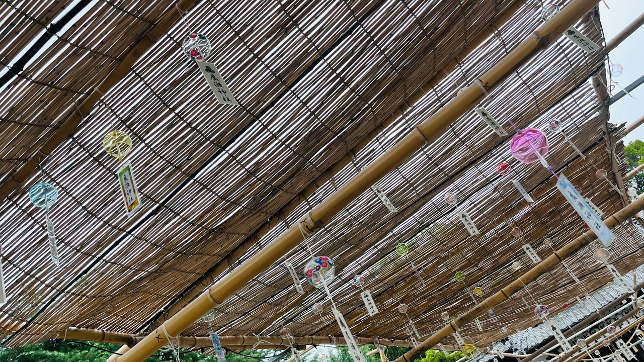 竹竿が境内中に張りめぐらされているので、まだ設営の途中で風鈴の数は増えるのかも知れません。