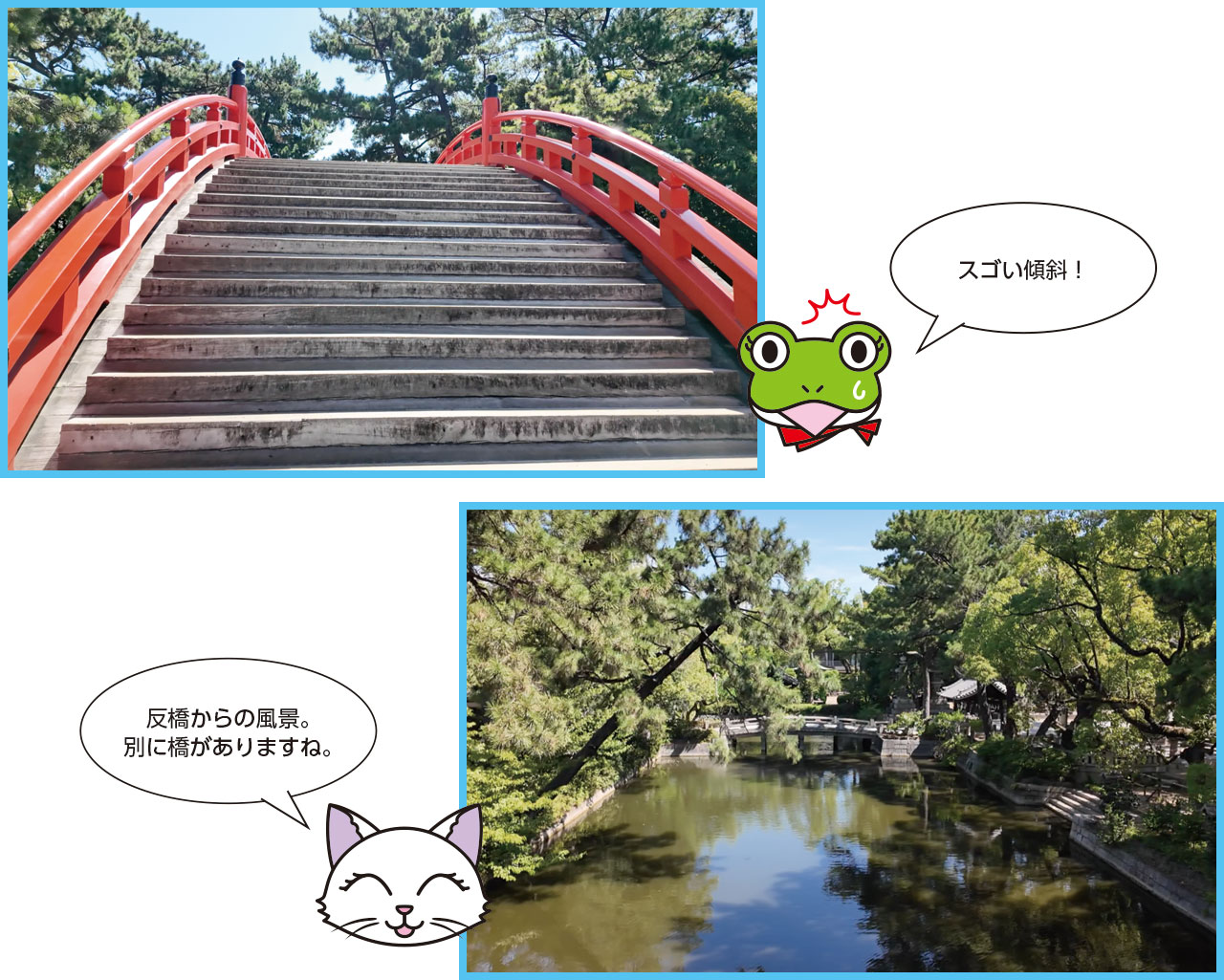 お年寄りや車イスの方も安心してください。緩やかな橋が反橋の両側にありますので、そちらからお通りください。