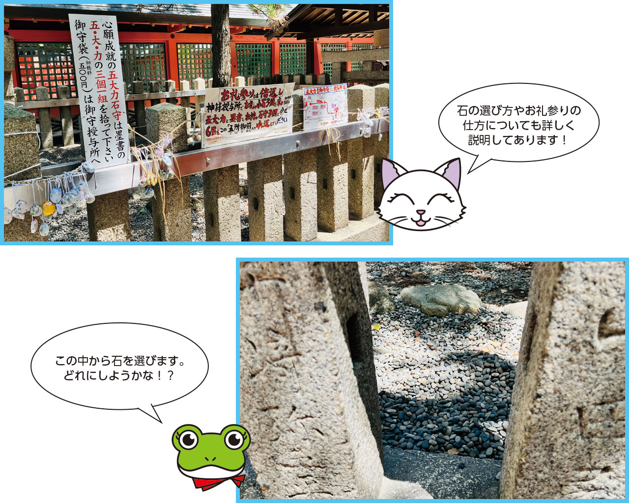 ここにある「五」「大」「力」と書かれた石を拾い御守にすると願い事が叶うと言われています。