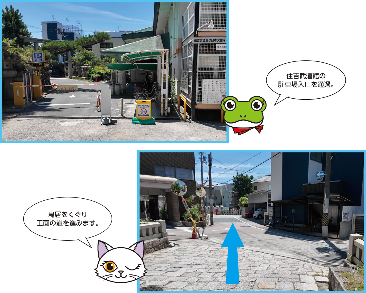 住吉武道館の駐車場入口を通過し、鳥居を抜けます。真っ正面の道を進みます。