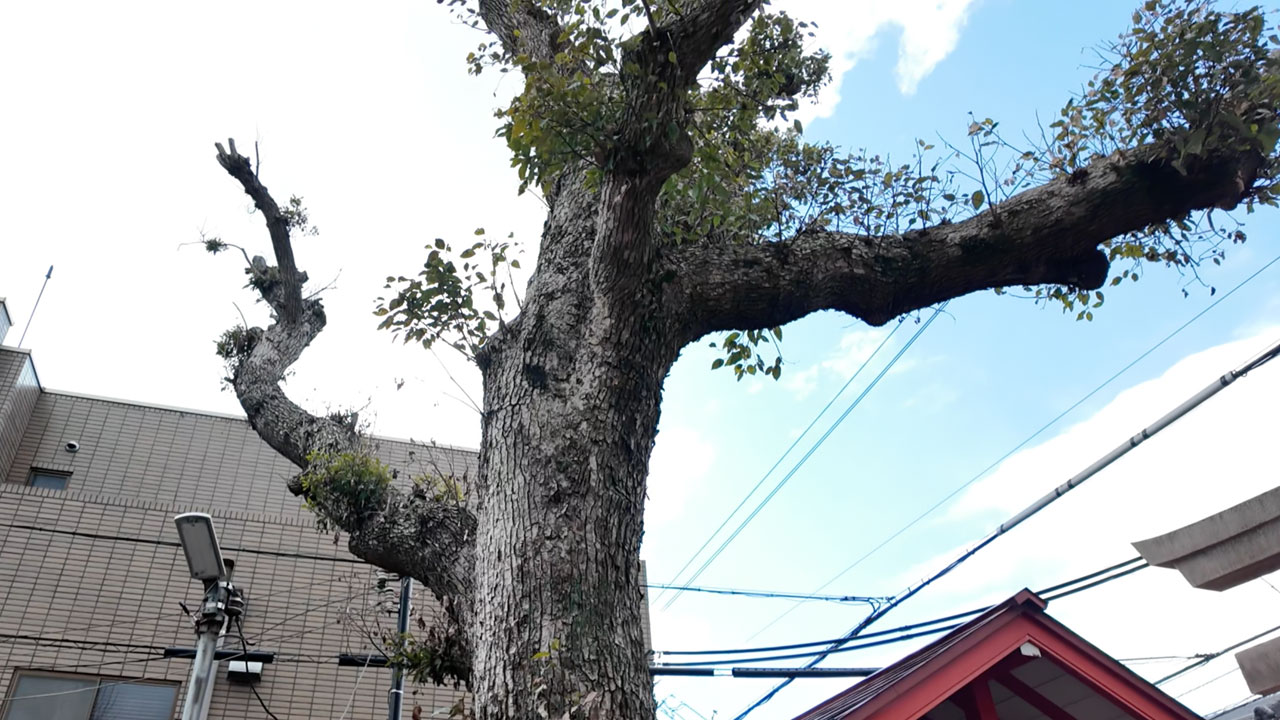 泰名稲荷神社のすぐ横にドーンと存在感を漂わせ立っているクスノキ