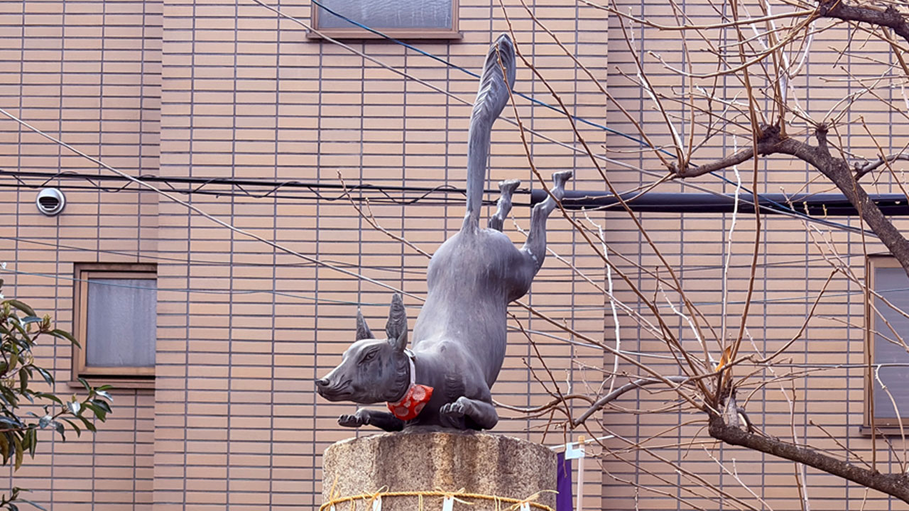 狐が飛来してきている石像は、「葛の葉子別れ伝説」を元に晴明の母の白狐「葛の葉」が、信太の森から飛来する姿を表現したもの。