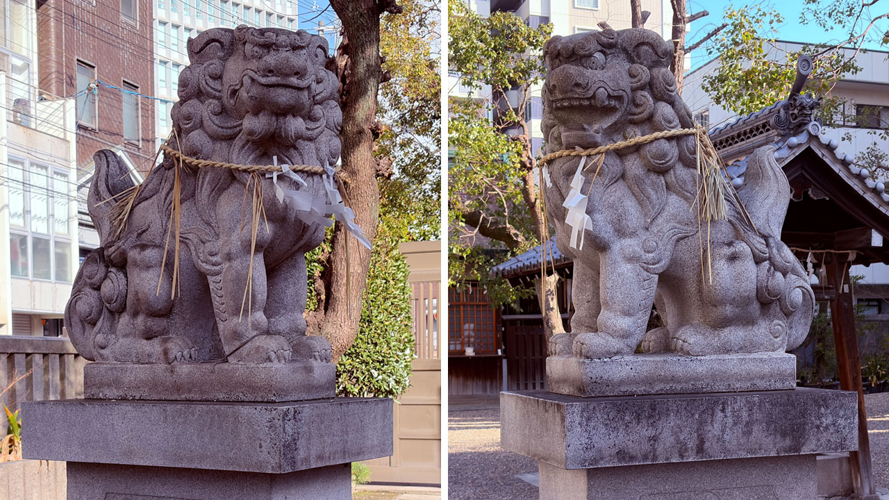 狛犬は通常、右側が口を開けた「阿形(あぎょう)」の獅子、左側が口を閉じたり玉(宝珠)をくわえた「吽形(うんぎょう)」の狛犬のペアになっています。